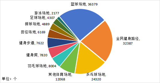 福建省球类运动场地82423个。其中,足球、篮球、排球“三大球”场地45575个,占55.29%;乒乓球和羽毛球场地32324个,占39.22%;其他球类运动场地4524个,占5.49%。