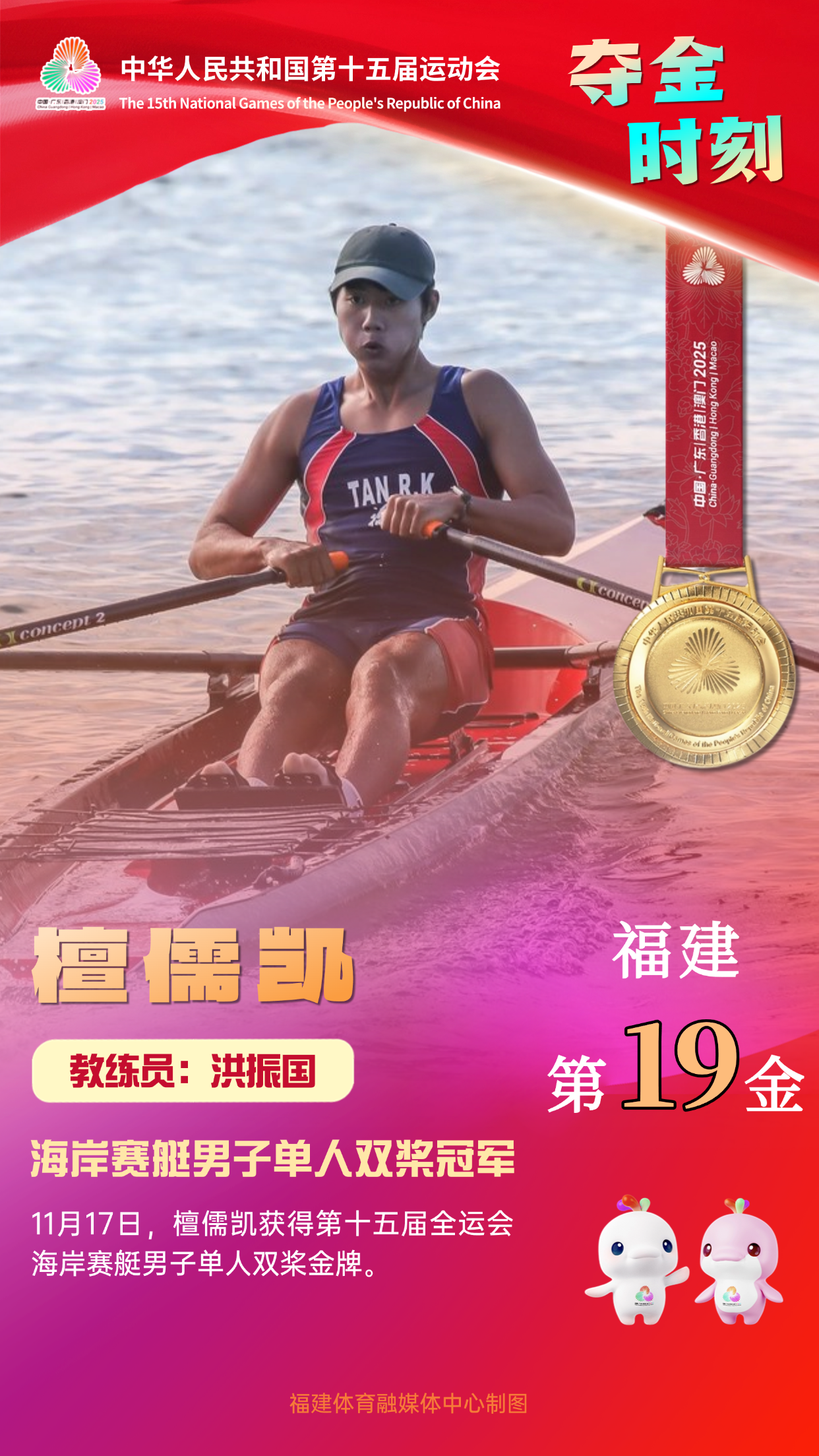檀儒凯获海岸赛艇男子单人双桨金牌!