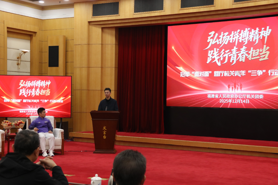 省政府办公厅部分青年干部职工代表作了交流发言,他们纷纷表示,冠军们在赛场上顽强拼搏、争金夺银,展现了敢为人先、爱拼会赢的精神特质,将认真向冠军们学习,切实把冠军们的崇高品质内化为严谨务实的作风,外化为服务高质量发展的实际行动,为福建在中国式现代化建设中奋勇争先贡献青春力量。