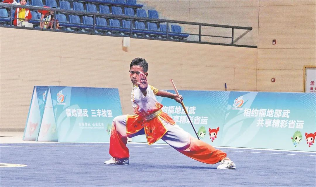踢腿、跳跃、跃扑、滚翻……赛场上,林罗杰的表现有板有眼。这是他的第一次省运会。