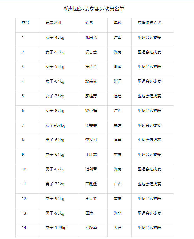 公示了中国举重队杭州亚运会参赛名单
