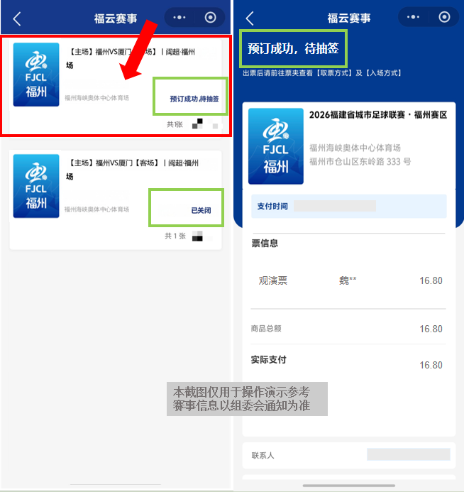本次闽超赛事实行预订购票制度,购票共四个步骤:用户下单预订→完成支付→参与抽签→接收短信通知出票结果。若中签,则出票成功;若未中签,将全额退款。所有预订购票均需进行实名认证,每张身份证对应一个预订抢票名额。在预订时,需录入观赛人员的真实姓名及有效身份证件号码。有效身份证件包括:居民身份证、中国护照、港澳居民往来内地通行证、台湾居民往来大陆通行证、外国人永久居留身份证、港澳台居民居住证以及户口本。