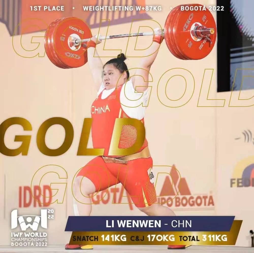 北京时间12月16日,2022年哥伦比亚世界举重锦标赛女子87公斤以上级决赛中,中国选手李雯雯以抓举141公斤,挺举170公斤,总成绩311公斤的成绩,包揽该项目三枚金牌。