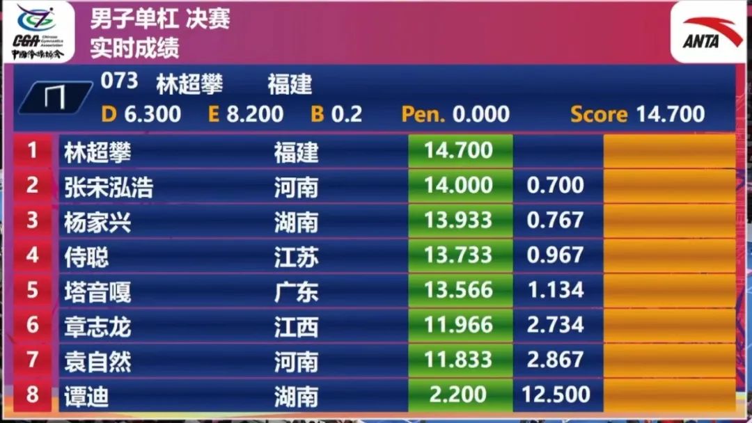 15日,全国体操冠军赛展开收官日的比拼,在男子单杠决赛中,福建体操名将林超攀发挥稳定,凭借超高的动作完成质量,难度分6.300、完成分8.200、总分14.700分,毫无悬念夺得男子单杠冠军,为2022年全国体操冠军赛做了一个非常精彩的收尾。