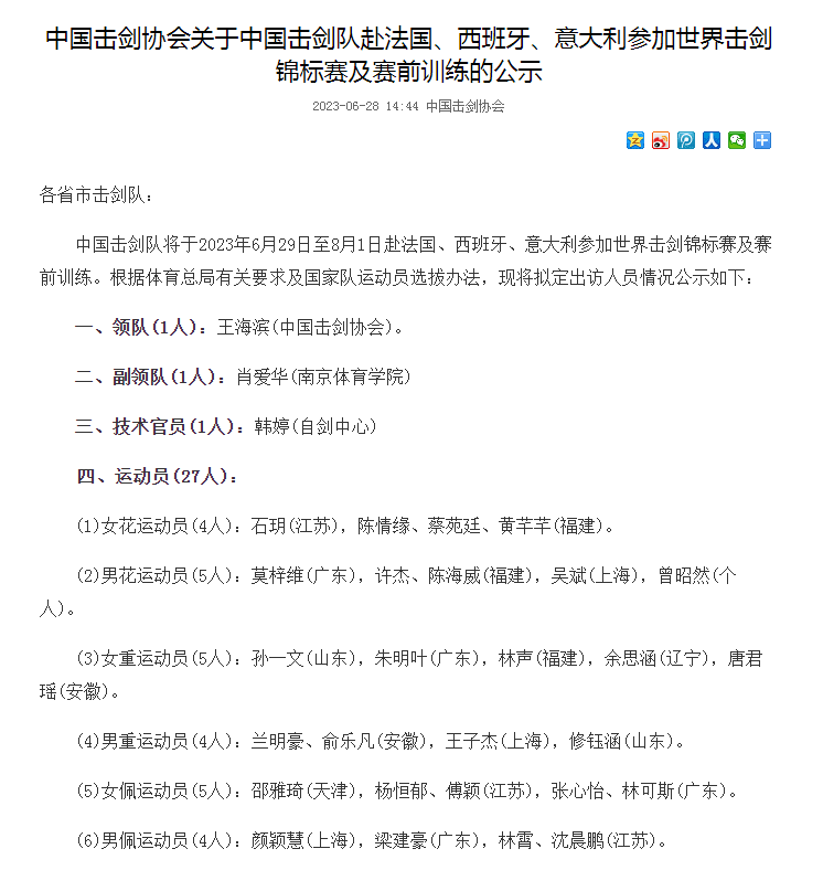 2023年世界击剑锦标赛将于7月22日至30日在意大利米兰举办,在整个奥运击剑项目资格体系中权重最高,个人赛积分系数 2.5(冠军 80 分)、团体赛积分系数 2.0(冠军 128 分)。