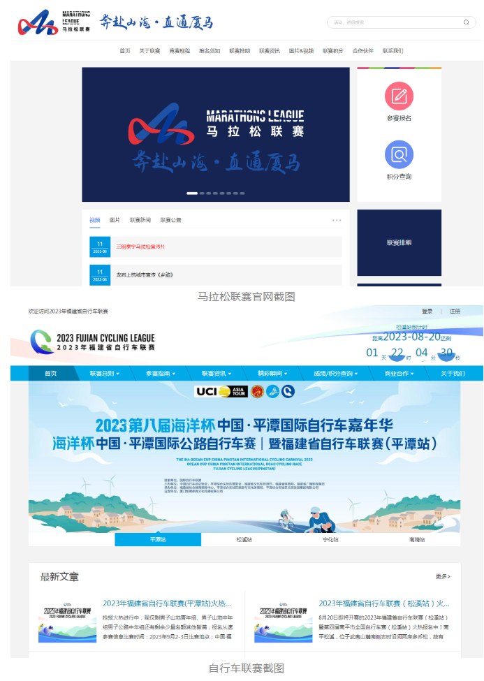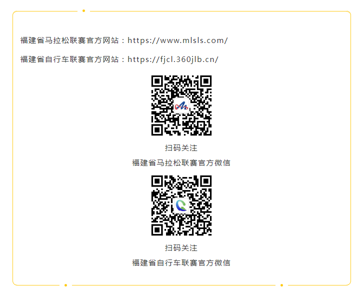马拉松、自行车联赛的官网将为广大马拉松和自行车运动爱好者提供赛事日程、赛事规则、参赛指南、成绩公告、积分查询、赛事风采、赛事咨询等一站式服务。广大的体育爱好者可以通过福建省体育局官网进入两项赛事的官网(文末也有官网链接哦),了解联赛情况、报名参赛。此外,两项联赛的官方微信,也将及时发布赛事的报名、参赛、住宿等服务信息。