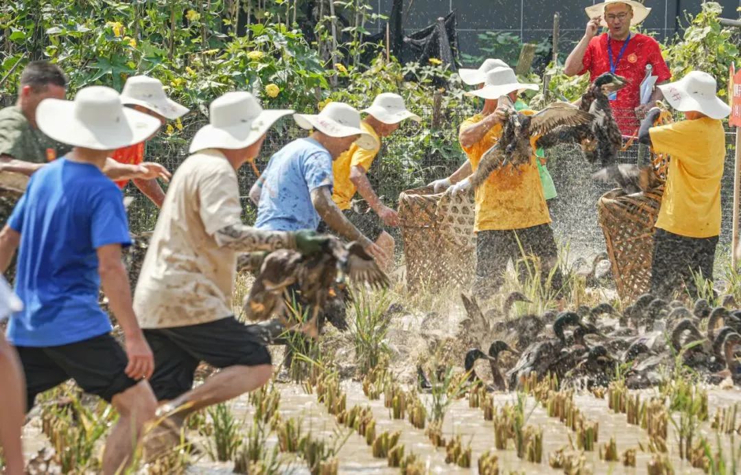 本次比赛设置了特产快收、抗旱取水、稻谷收割、徒手抓鸭、友谊拔河等五个比赛项目,来自全区的14支队伍100余位选手参加。