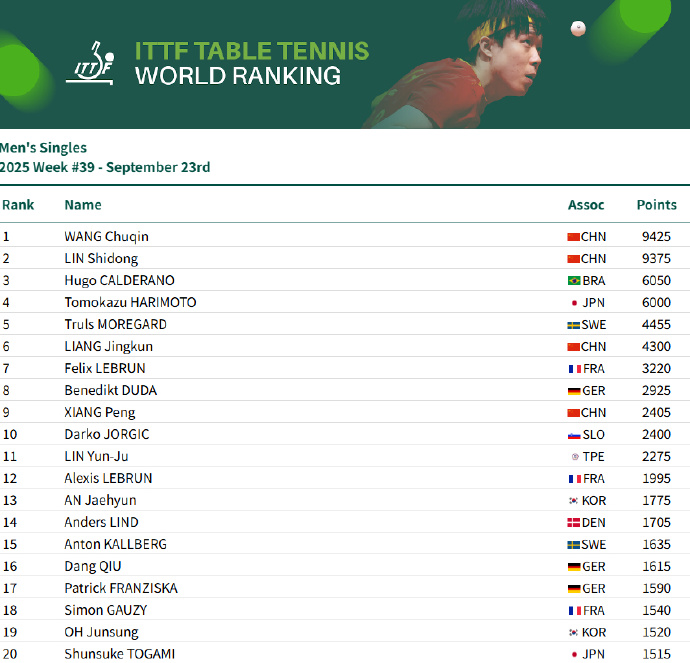2025国际乒联第39周排名公布