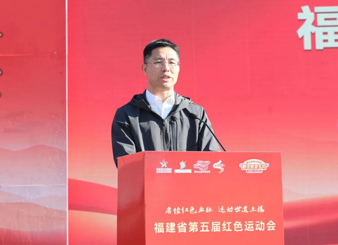 省体育局二级巡视员、群体处处长苏德新在开幕式上致辞。他指出,习近平总书记在福建调研时强调,“福建是革命老区,红色资源多、革命先辈多,要把红色资源利用好、红色传统发扬好、红色基因传承好”。这一重要指示为我们传承红色体育精神、推进体育强省建设指明了方向。南靖作为世界文化遗产所在地,兼具红色资源与生态优势,为赛事搭建了“红色场景+运动空间”的独特舞台。希望全省体育工作者在富有挑战性与教育意义的竞赛项目中,将体育精神与革命精神融为一体,凝聚成加快建设体育强省的磅礴力量。