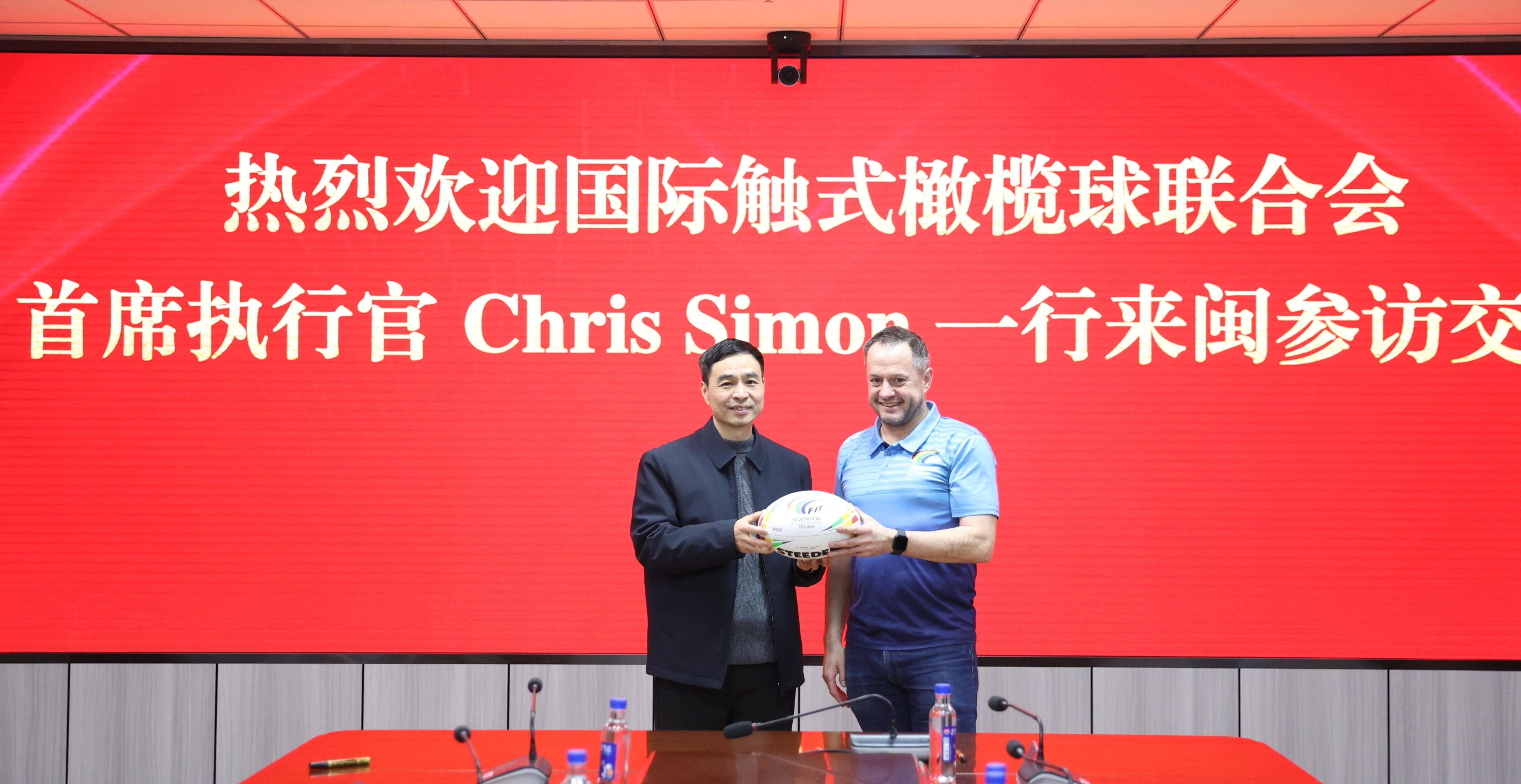 会谈期间,双方气氛热烈友好。Chris Simon 详细介绍了国际触式橄榄球运动的发展经验与未来前景,并对福建青少年群体中展现出的橄榄球热情给予高度评价。他特别向福建省体育局发出诚挚邀请,希望福建能派团到国际触式橄榄球联合会总部参观考察并观摩即将举办的触式橄榄球高水平国际赛事,为双方未来的深度合作奠定基础。